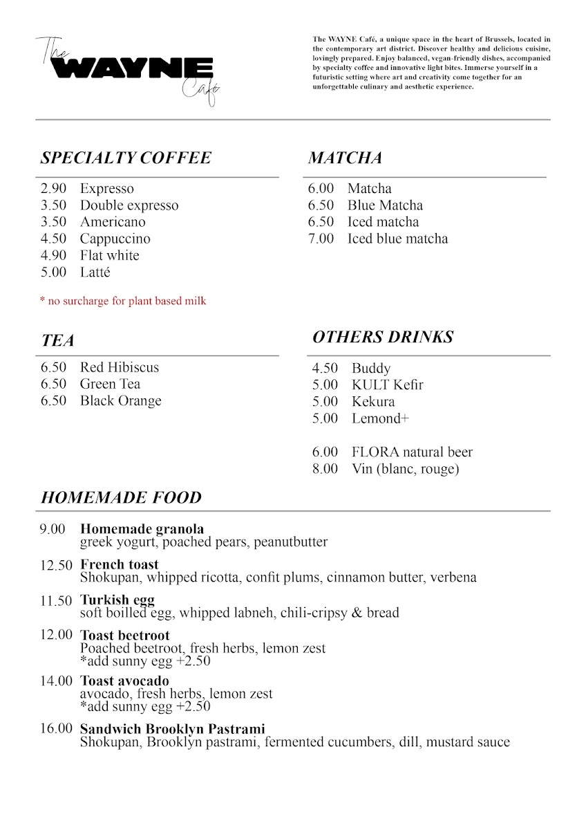The WAYNE Café offers a straightforward and inviting menu that complements its relaxed, two-floor setting. The focus here is on simple café fare and comforting drinks, designed for both quiet mornings and casual midday breaks.